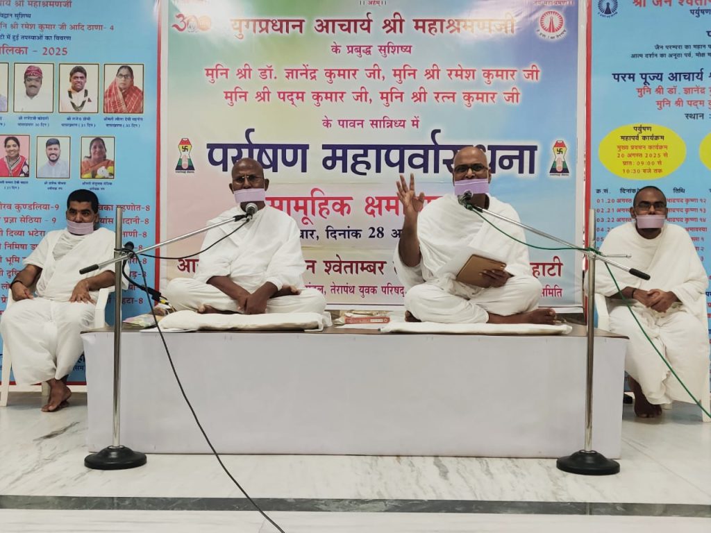 आचार्य महाश्रमण के प्रबुद्ध सुशिष्य मुनि डॉ. ज्ञानेंद्र कुमार जी, मुनि रमेश कुमार जी , मुनि पद्म कुमार जी एवं मुनि रत्न कुमार जी के पावन सान्निध्य में पर्वाधिराज पर्युषण महापर्व के अंतिम दिन वृहस्पतिवार को प्रात: 9 बजे से स्थानीय तेरापंथ धर्मस्थल में क्षमायाचना दिवस का भव्यातिभव्य समारोह का आयोजन उल्लासमय वातावरण में संपन्न हुआ। इस अवसर पर अपने प्रेरक उद्बोधन में मुनि डॉ. ज्ञानेंद्र कुमार ने कहा कि खमतखामणा और अपनी भूलों का प्रतिक्रमण इस पर्व की आत्मा है। ग्रंथि भेद अपेक्षित है। इस पर्व की प्रेरणा यही है कि मन की गांठें खोलें।